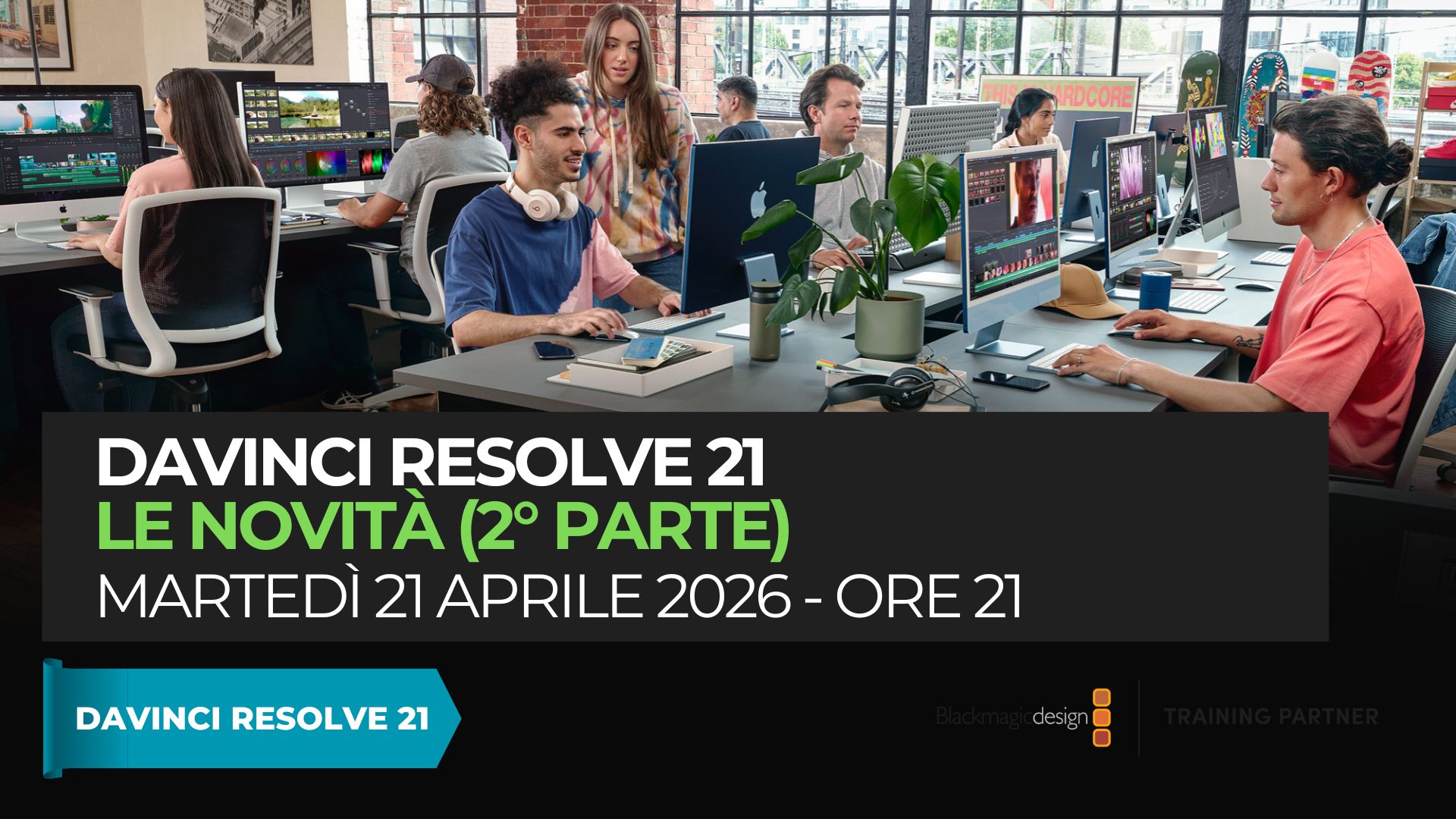 Master dell'Automazione in DaVinci Resolve 20. Un percorso "6+1": 6 webinar tecnici su Metadati, Fusion Macros, Color, Fairlight e AI, più un Workshop pratico finale di 3 ore.